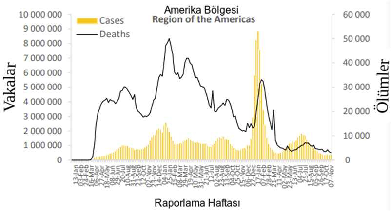 Amerika Bölgesi, bir önceki haftaya göre %12 artışla 418.000'den fazla yeni vaka bildirmiştir. Verilerin mevcut olduğu 56 ülkenin 17'si (%30) yeni vakalarda %20 veya daha fazla artış bildirmiş olup en yüksek oransal artışlardan bazıları Guyana (altı yeni vakaya karşı 19; %+217), Paraguay (69’a karşı 25 yeni vaka; +%176 ve Küba (26'ya karşı 10 yeni vaka; +%160) bildirilmiştir. En yüksek yeni vaka sayıları Amerika Birleşik Devletleri (281.955 yeni vaka; 100.000'de 85.2 yeni vaka; +%6), Brezilya (59.135 yeni vaka; 100.000'de 27.8 yeni vaka; +%120) ve Şili’den (46.640 yeni vaka; 100.000'de 244.0 yeni vaka; +%32) rapor edilmiştir..