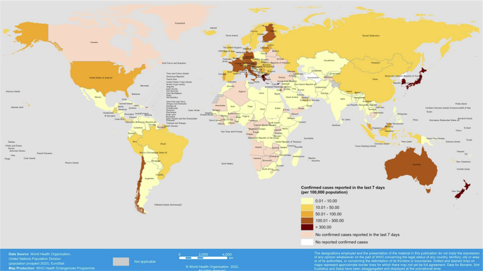 Ülke düzeyinde, en yüksek yeni haftalık vaka sayıları Japonya (503.766 yeni vaka; +%25), Güney Kore (355.990 yeni vaka; +%19), Amerika Birleşik Devletleri(281.955 yeni vakalar; +%6), Almanya (184 987 yeni vaka; -%25) ve Çin’den (171 745 yeni vaka; -%22) bildirilmiştir. En yüksek yeni haftalık ölüm sayıları Amerika Birleşik Devletleri (2323 yeni ölüm; -%6), Japonya (552 yeni ölüm; +%41), Rusya Federasyonu (436 yeni ölüm; -%10), Çin (410 yeni ölüm; -%24) ve Fransa’dan (390 yeni ölüm; -%10) rapor edilmiştir.