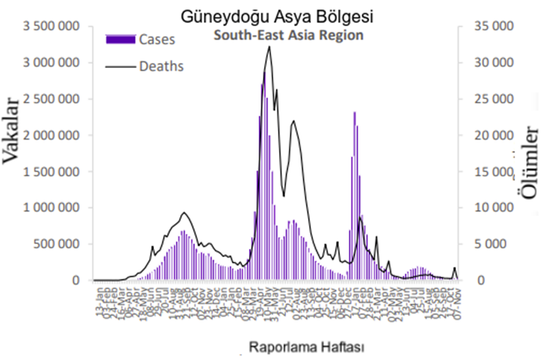 Bölgede haftalık yeni ölüm vakası sayısı bir önceki haftaya göre %80 azalmış ve 353 yeni ölüm bildirilmiştir. En yüksek yeni ölüm vakası sayıları Endonezya (275 yeni ölüm; 100.000'de <1 yeni ölüm; +%19), Tayland (42 yeni ölüm; 100.000'de <1 yeni ölüm; +%5) ve Hindistan'dan ( 31 yeni ölüm; 100.000'de <1 yeni ölüm; -%98) rapor edilmiştir.