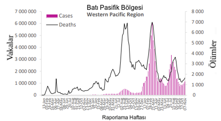 Bölgede haftalık yeni ölüm vakası sayısı bir önceki haftaya göre %14 artarak 1643 yeni ölüm bildirilmiştir. En yüksek yeni ölüm vakası sayıları Japonya (552 yeni ölüm; 100.000'de <1 yeni ölüm; +%41), Çin (410 yeni ölüm; 100.000'de <1 yeni ölüm; -%24) ve Güney Kore’den (291 yeni ölüm; 100.000'de <1 yeni ölüm; +%35) rapor edilmiştir.