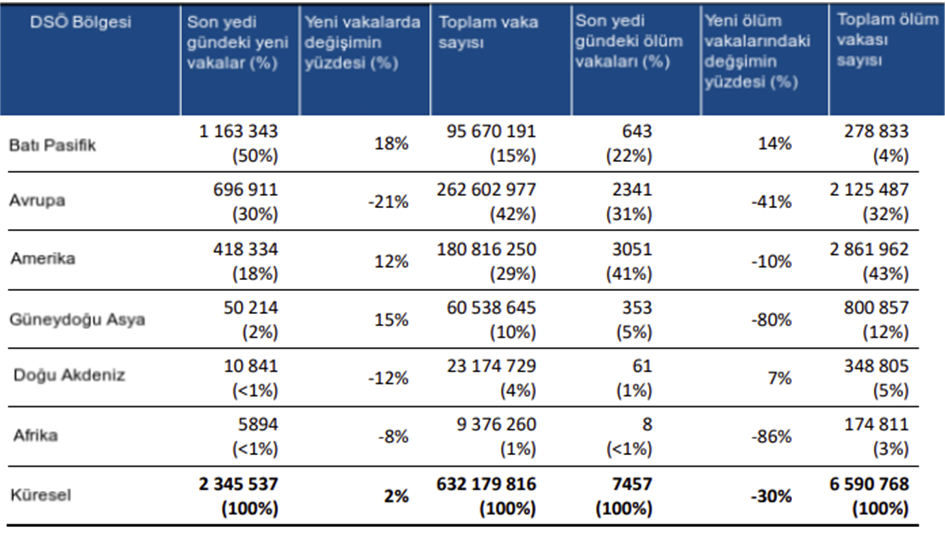 Tablo 1. 13 Kasım 2022 itibariyle DSÖ Bölgelerine göre, son yedi günde bildirilen ve kümülatif COVID-19 vakalarının ve COVID-19 kaynaklı ölümlerin sayısı **