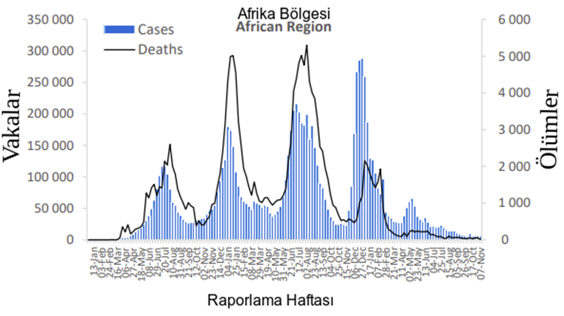 Afrika Bölgesi, bir önceki haftaya göre %8 düşüşle yaklaşık 5900 yeni vaka bildirmiştir. Verilerin mevcut olduğu 50 ülkenin onu (%20) yeni vakalarda %20 veya daha fazla artış bildirmiştir; orantılı olarak en yüksek artışlar Mayotte (76'ya karşı 19 yeni vaka; +%300), Benin (yediye karşı üç yeni vaka; +%133 ve Mozambik’te (44'e karşı 24 yeni vaka; +%83) gözlenmiştir. En yüksek yeni vaka sayıları Güney Afrika (3445 yeni vaka; 100.000 nüfusta 5.8 yeni vaka; +%73), Kenya (700 yeni vaka; 100.000'de 1.3 yeni vaka; +%18) ve Réunion'dan ( 509 yeni vaka; 100.000'de 56,9 yeni vaka; +%32) rapor edimiştir.
