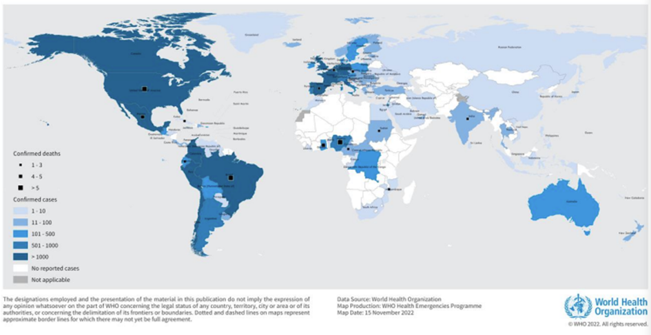Şekil 3. 1 Ocak – 13 Kasım 2022 tarihleri arasında ve saat 17:00 (CEST) itibariyle resmi kamu kaynaklarından DSÖ'ye bildirilen veya DSÖ tarafından tanımlanan doğrulanmış maymun çiçek hastalığı vakalarının coğrafi dağılımı