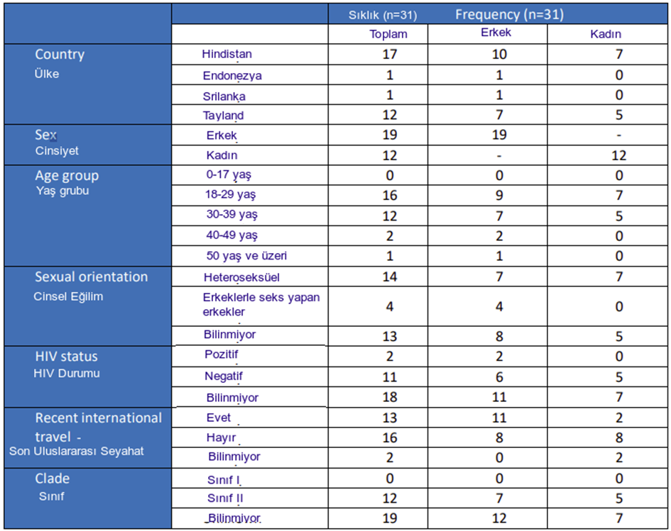 - Salgın, esas olarak genç erkekleri etkilemeye devam ediyor, mevcut verilere sahip vakaların %96,9'u (44 631/46 067), yaş ortalamaları 34 (çeyrekler arası aralık: 29-41 yaş) olan erkeklerdir; Yaş verileri mevcut olan vakaların %1,2'si (n=560) 0-17 yaş arasındadır ve bunların 149'u (%0,3) 0-4 yaş arasındadır. Bu oran bölgeler arasında farklılık göstermektedir ve 0-17 yaş arası vakaların en büyük oranı Amerika Bölgesi'nden rapor edilmektedir (412/560; %74).