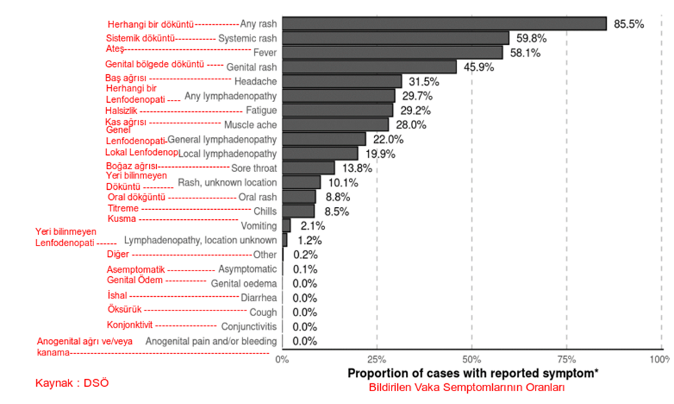 Şekil 2. 13 Kasım 2022 itibarıyla küresel olarak maymun çiçeği vakaları tarafından bildirilen semptomların sıklığı (n=32 886)