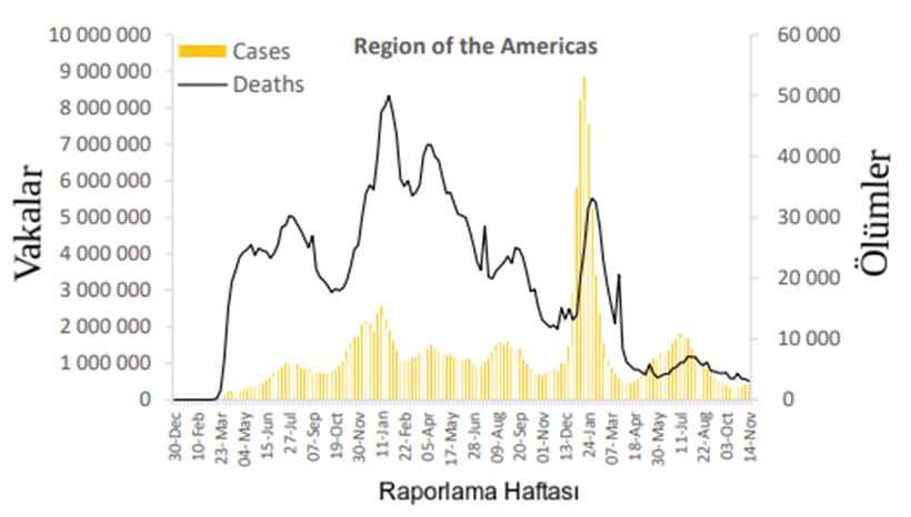 Amerika Bölgesi, bir önceki haftaya göre %3 artışla 454.000'den fazla yeni vaka bildirmiştir. Verilerin mevcut olduğu 56 ülkenin on ikisi (%21) yeni vakalarda %20 veya daha fazla artış bildirmiş olup en yüksek orantılı artış Guyana'da (61'e karşı 19 yeni vaka; +%221), Fransız Guyanası'nda (308'e karşı 308 yeni vaka112 yeni vaka; +%175 ve Dominik Cumhuriyeti (490'a karşı 222 yeni vaka; +%121) gözlemlenmiştir. En yüksek yeni vaka sayıları Amerika Birleşik Devletleri (274.067 yeni vaka; 100.000'de 82.8 yeni vaka; -%3), Brezilya (91.297 yeni vaka; 100.000'de 43.0 yeni vaka; +%54) ve Şili’den (39.013 yeni vaka; 100.000'de 204.1 yeni vaka; -%16) rapor edilmiştir.