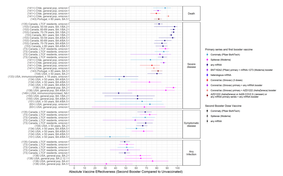 On üç çalışma, mRNA aşılarının ikinci bir takviye dozunun mutlak VE'sini değerlendirerek, dört doz alan kişilerde enfeksiyon ve hastalık olaylarını aşılanmamış bir karşılaştırma grubuyla karşılaştırmıştır. Omicron'a bağlı ölüm, şiddetli hastalık, semptomatik hastalık ve enfeksiyona karşı bir mRNA aşısı ile ikinci takviye dozunun VE'si sırasıyla %100 (5/5), %74 (23/31), %10 (1/10) ve %11 (1/9) arasında ≥%70 olmuştur (Şekil 6).