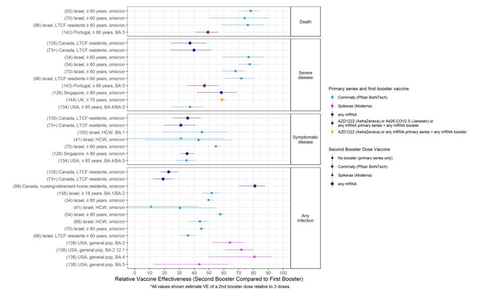 Uzun süreli bakım tesisi sakinleri, yaşlı yetişkinler, sağlık çalışanları ve 18 yaş ve üstü yetişkinler arasında yürütülen bugüne kadar 17 çalışma, Omicron enfeksiyonunun nispeten yakın geçmişten dokuz ay öncesine kadar değişen çeşitli zaman noktalarında mRNA aşılarının yalnızca ilk takviye dozunu almış kişilere ikinci rapel dozunu alan kişiler arasında semptomatik hastalık,ciddi hastalık ve ölüm riskini karşılaştırarak mRNA aşılarının ikinci rapel dozunun göreli VE'sini değerlendirmiştir.