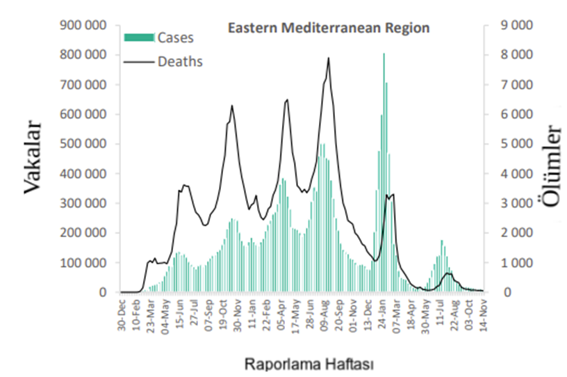 Bölgede haftalık yeni ölüm vakası sayısı bir önceki haftaya göre %20 azalmış olup 49 yeni ölüm vakası bildirilmiştir. En yüksek yeni ölüm vakası sayıları İran (15 yeni ölüm; 100.000'de <1 yeni ölüm; -%17), Suudi Arabistan (14 yeni ölüm; 100.000'de <1 yeni ölüm; -%7) ) ve Lübnan’dan (yedi yeni ölüm; 100.000'de <1 yeni ölüm; önceki hafta hiç ölüm bildirilmemiştir) rapor edilmiştir.