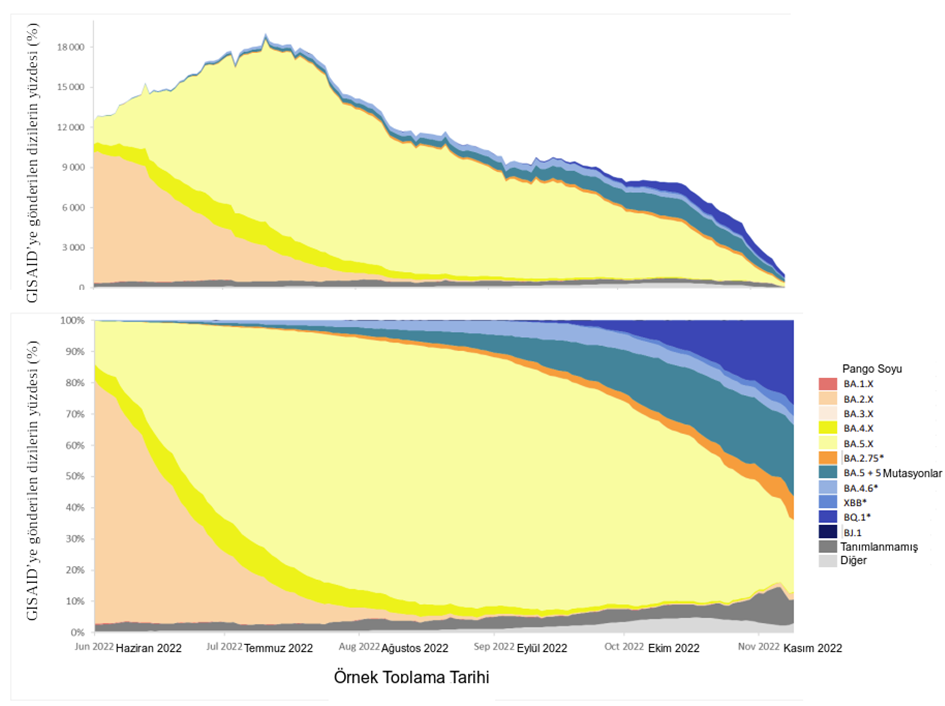 Şekil 4. Tablo A ve B: 21 Kasım 2022 itibariyle SARS-CoV-2 dizilerinin sayısı ve yüzdesi