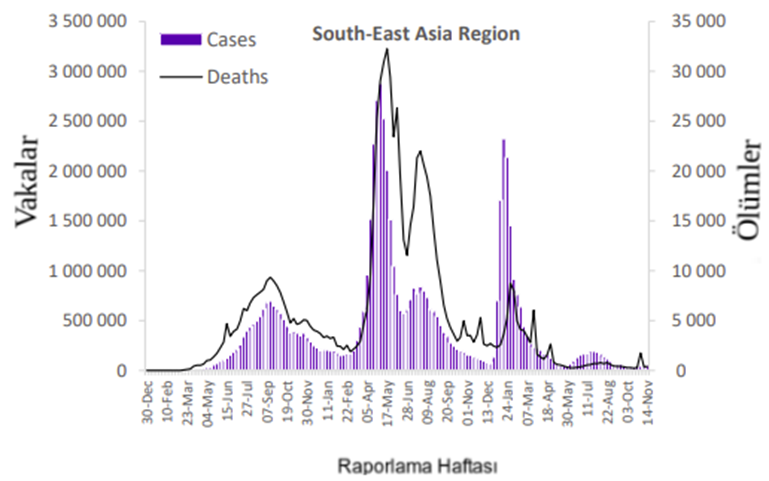 Bölgede haftalık yeni ölüm vakası sayısı bir önceki haftaya göre %13 artmış olup 399 yeni ölüm vakası bildirilmiştir. En yüksek yeni ölüm vakası sayıları Endonezya (275 yeni ölüm; 100.000'de <1 yeni ölüm; önceki hafta hiç ölüm bildirilmemiştir), Tayland (69 yeni ölüm; 100.000'de <1 yeni ölüm; +%64) ve Hindistan’dan (43 yeni ölüm; 100.000'de <1 yeni ölüm; +%39) rapor edilmiştir.