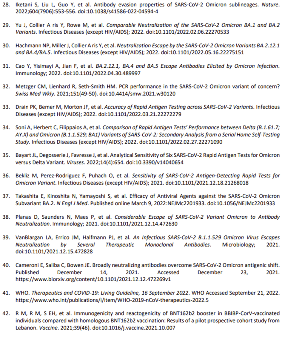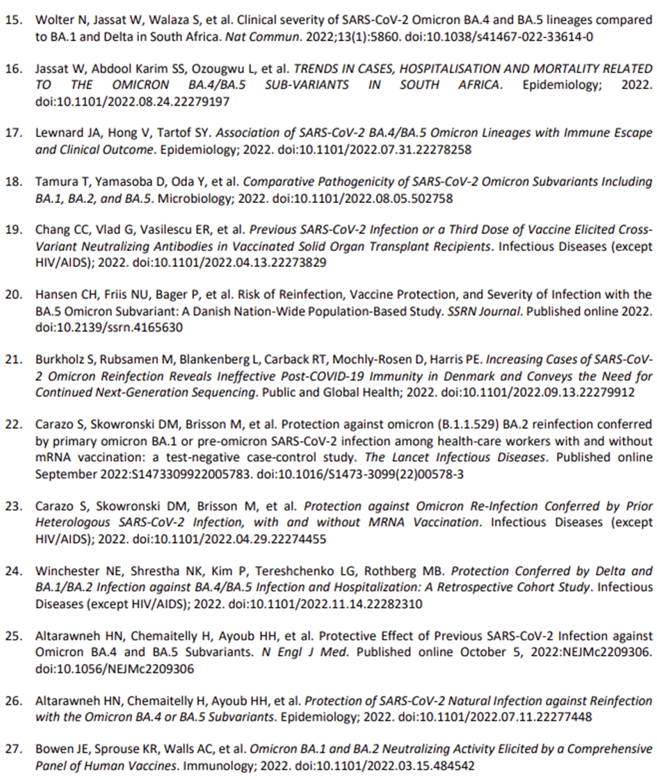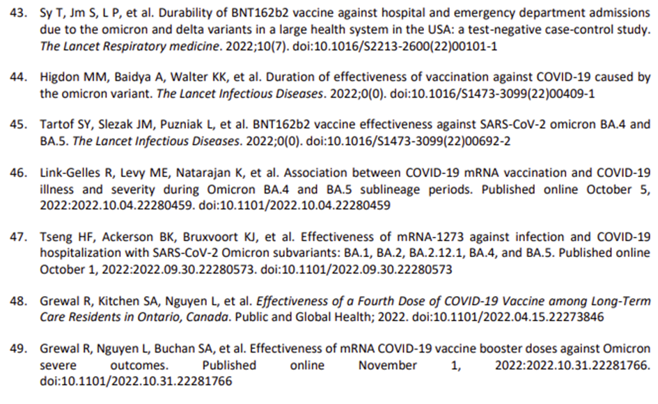 Son güncellemeden bu yana, Amerika Birleşik Devletleri'ndeki yetişkinler arasında 24.356 sağlık hizmeti karşılaşmasına ilişkin bir çalışma, aşının Omicron alt soylarına karşı etkinliğine dair yeni kanıtlar sağlamıştır. Çalışma, Pfizer BioNTech-Comirnaty ile birincil seri aşılamanın, BA.4/BA.5 nedeniyle ayakta tedavi, acil bakım veya acil servis ziyaretleri ve hastaneye yatışlara karşı çok az koruma sağladığını tespit etmiştir. Pfizer BioNTech Comirnaty'nin takviye dozunu hastaneye yatışa karşı VE’si >%70 olmuş olup bu değer altı ayda <%50'ye düşmüş ve daha hafif sonuçlara karşı VE’si ise >%50 olmuş olup söz konusu değer üç ayda <%50'ye düşmüştür (45).