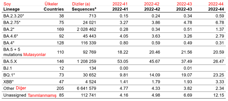 44. epidemiyolojik hafta boyunca (31 Ekim - 6 Kasım 2022), BA.5 soyundan gelen soylar, %72,1'lik bir prevelansla baskın soy olmuş olup bunu 43. haftada (24 - 30 Ekim 2022) %6,4'ten artışla %9,2'lik bir prevelansla BA.2 soyundan gelen soylar izlemiştir. BA.4 altsoylarının yaygınlığı, aynı raporlama döneminde %3,6'dan %3,0'a düşerek düşmeye devam etmiştir. 43 ve 44. haftalar arasında BA.1.X'in prevalansı <%1 iken BA.3.X sekansları bildirilmemiştir. Şekil 4 ve Tablo 2, düzenli olarak güncellenen bir liste olan izleme altındaki Omicron alt varyantları olarak sınıflandırılan altı varyantın küresel oranlarını ve prevalansını göstermektedir. 21 Kasım itibariyle, sırasıyla 73 ve 47 ülkeden BQ.1 ve XBB (BA.2.10.1 ve BA.2.75'in bir rekombinantı) ve bunların alt soyları rapor edilmiştir. Epidemiyolojik 43. ve 44. haftalarda küresel olarak sunulan dizilerin karşılaştırılması, BQ.1 dizilerinde %19,1'den %23,1'e bir artış olduğunu göstermektedir. Benzer şekilde, XBB dizilerinin prevelansı da artarak 43. haftada %2,0'den 44. haftada %3,3'e yükselmiştir.