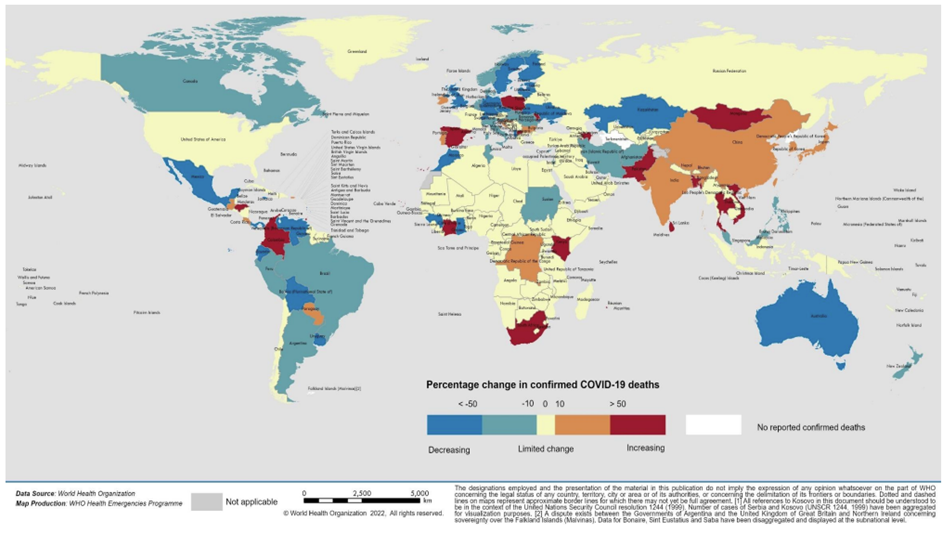 Ülke düzeyinde, en yüksek yeni haftalık vaka sayıları Japonya (593.075 yeni vaka; +%18), Güney Kore (364.536 yeni vaka; +%2), Amerika Birleşik Devletleri (274.067 yeni vaka -%3), Fransa (186.446 yeni vaka; +%23) ve Çin’den (158.813 yeni vaka; -%8) rapor edilmiştir. En yüksek yeni haftalık ölüm vakası sayıları Amerika Birleşik Devletleri (2202 yeni ölüm; -%5), Japonya (702 yeni ölüm; +%27), Çin (476 yeni ölüm; +%16), Fransa (441 yeni ölümler; +%9 ve Rusya Federasyonu’ndan (430 yeni ölüm; -%1) bildirilmiştir.
