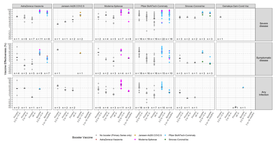 Noktalar, her çalışmadan elde edilen VE'nin nokta tahminlerini temsil eder; koyu siyah yatay çizgiler, katmandaki tüm çalışmalarda ortalama Aşı Etkinliği-VE'yi temsil eder. Tüm veriler, COVID-19 VE çalışmalarının sistematik bir incelemesinden alınmıştır; VE çalışmalarının yöntemleri ve özet tabloları view-hub.org adresinde bulunabilir. Dikey paneller, sütun başlığında belirtilen birincil serilerin aşısı ile birincil seri aşılamanın tamamlanmasının ardından tam birincil seri (gri noktalar) için VE'yi ve homolog veya heterolog hatırlatma dozu-güçlendirici aşılama için (diğer renkli noktalar) VE'yi temsil eder. Tüm hatırlatma dozu-booster VE tahminleri, ilk booster dozu içindir. Şiddetli hastalık hastaneye yatmayı içerir; semptomatik hastalık, herhangi bir şiddet seviyesindeki hastalığı içerir; herhangi bir enfeksiyon, semptomatik ve asemptomatik enfeksiyonu içerebilir. Konuda gösterilmemiştir: Çizimde gösterilmemiştir: Pekin CNBG-BBIBP-CorV'nin birincil serisinden 0,5-<3 ay sonra şiddetli hastalığa karşı VE (%59, %95 CI: %4 ila 80). Tahminlerin metinde verilen grafiklere dahil edilmesine yönelik yöntemler hakkında ek ayrıntılar.