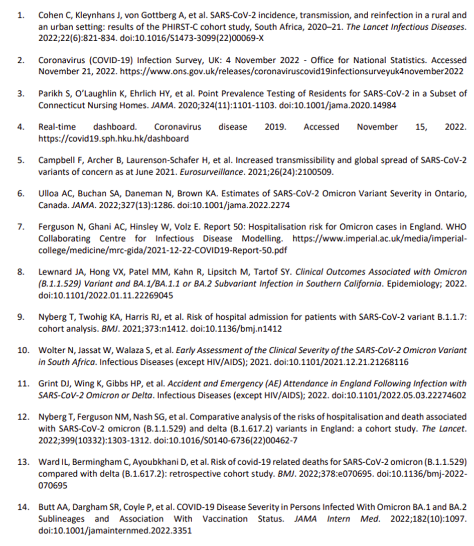 Daha önce (19) ve daha yakın zamanda (22) bildirilen BA.1 ile enfeksiyonu takiben yeniden enfeksiyon riskinde azalma vardır. Ancak yakın tarihli bir çalışma, Omicron olmayan VOC'lere kıyasla herhangi bir Omicron alt soyu ile önceki enfeksiyonun ardından yeniden enfeksiyon riskinin arttığını bildirmiştir (21). |