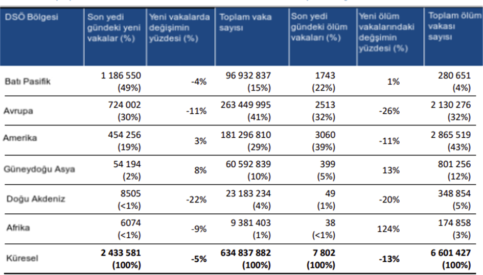 20 Kasım 2022 itibariyle, dünya çapında 634 milyondan fazla doğrulanmış vaka ve 6,6 milyon ölüm bildirilmiştir. Bölgesel düzeyde, yeni bildirilen haftalık vaka sayısı altı DSÖ bölgesinin beşinde azalmış veya sabit kalmıştır: Güneydoğu Asya Bölgesi'nde vaka sayıları artarken (+%8) Doğu Akdeniz Bölgesi (%-22), Avrupa Bölgesi (%-11), Afrika Bölgesi (%-9) ), Batı Pasifik Bölgesi (%-4) ve Amerika Bölgesi’nde (%+3) ya azalmış ya da sabit kalmıştır. Yeni bildirilen haftalık ölüm vakalarının sayısı dört bölgede azalmış veya sabit kalmıştır: Afrika Bölgesi'nde (+%124; 38'e karşı sekiz ölüm) ve Güneydoğu Asya Bölgesi'nde (+%13) ölüm vakası sayıları artarken Avrupa Bölgesi (%-26), Doğu Akdeniz Bölgesi (%-20), Amerika Bölgesi (%-11) ve Batı Pasifik Bölgesi’nde ya azalmış ya da sabit kalmıştır ( +%1).