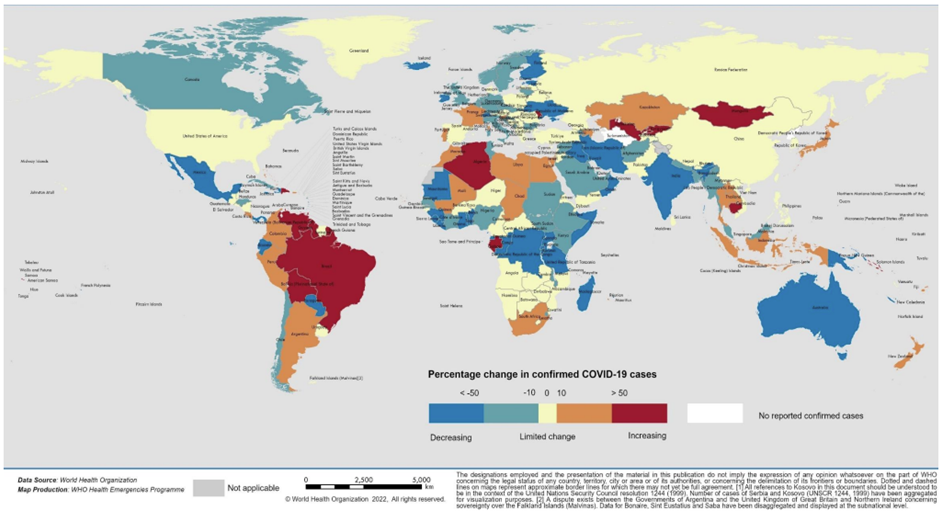 Küresel olarak, haftalık yeni COVID-19 vaka sayısı 14-20 Kasım 2022 tarihleri arasında bir önceki haftaya göre %5 azalmış olup 2,4 milyondan fazla yeni vaka bildirilmiştir