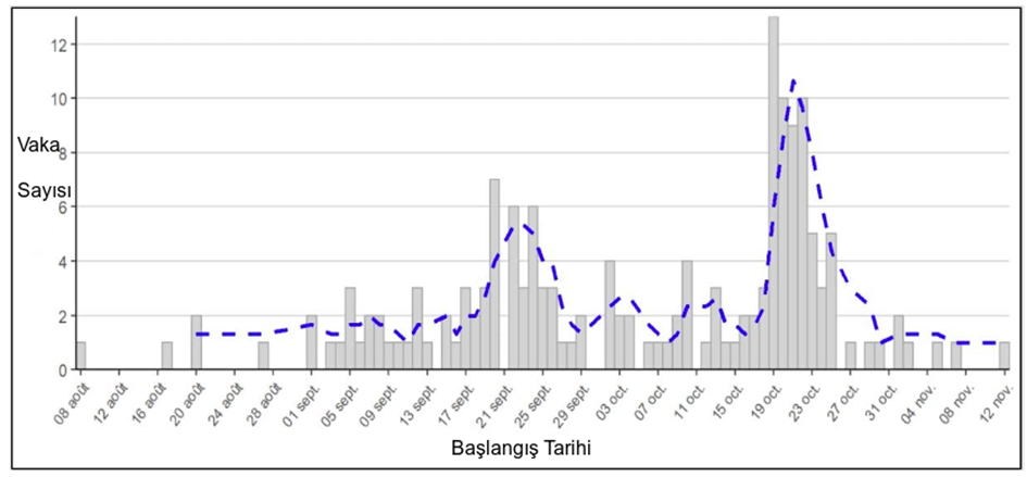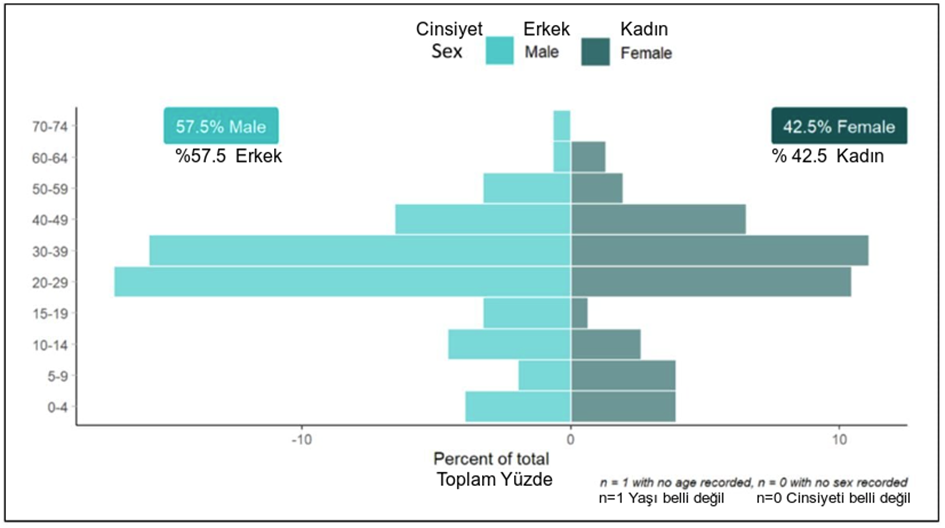 Vakaların çoğu erkek (%57,5) olup en çok etkilenen yaş grubu 20-29 yaş grubudur, bunu 30-39 yaş grubu takip etmektedir (Şekil 2). Vakaların yaklaşık %25'i 10 yaşın altındaki çocuklar arasında rapor edilmiş olup bu da potansiyel ev içi bulaşma olduğunu göstermektedir.
