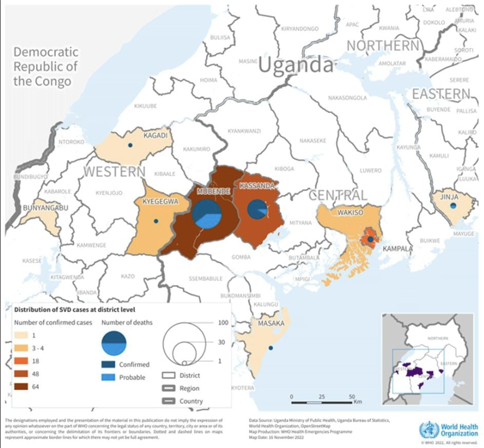 10 Kasım'da yayınlanan son Hastalık Salgınları Haberleri-DON'dan bu yana, yeni etkilenen bir bölge rapor edilmiş olup (Jinja), bu da toplam dokuz ilde doğrulanmış SVD vakası bildirilmesine yol açmıştır. En çok etkilenen bölge, 64 (%45) doğrulanmış vaka ve 29 (%53) doğrulanmış ölümle Mubende’dir, onu 48 (%34) doğrulanmış vaka ve 20 (%36) doğrulanmış ölüm vakasıyla Kassanda izlemektedir. İki il, Bunyangabu ve Kagadi, 42 günden uzun süredir vaka bildirmemiştir.