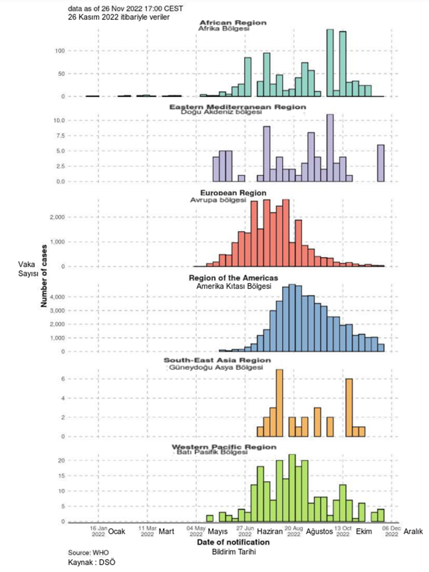 Küresel olarak bildirilen haftalık yeni vaka sayısı, 46. haftaya (14 - 20 Kasım) (n = 1090 vaka) kıyasla 47. haftada (21 - 27 Kasım) (n = 588 vaka) %46 azalmış ve en büyük oransal düşüşler kümülatif vaka sayısının en yüksek olduğu iki bölge olan Amerika Bölgesi (% -48) ve Avrupa Bölgesi'nde (% -15) gözlenmiştir. 21 Kasım ile başlayan haftada, Doğu Akdeniz Bölgesi, arka arkaya beş hafta vaka bildirilmezken sonrasında Lübnan'dan altı yeni vaka bildirmiştir. Bunlar, 1 Ekim ile 25 Kasım 2022 arasında teşhis edilen vakaların retrospektif raporlarıdır.