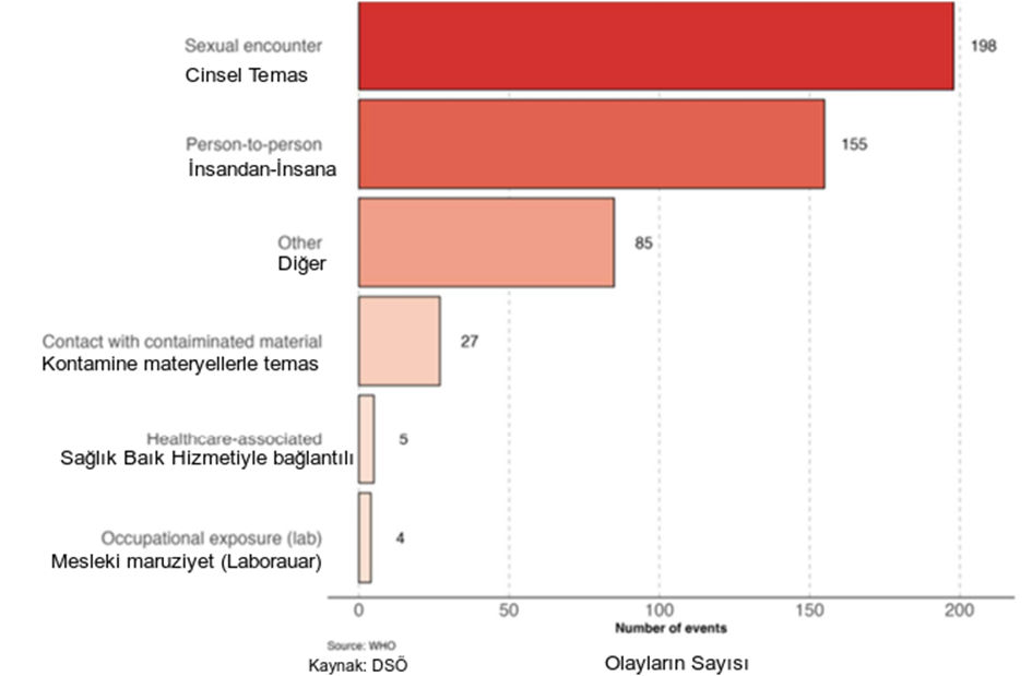 - Bildirilen cinsel eğilimli vakaların %84,8'i (24 251/28 607) eşcinsel, biseksüel ve erkeklerle seks yapan diğer erkekler olarak tanımlanmıştır. Bildirilen tüm bulaşma yolları arasında, cinsel aktiviteler sırasında cilt ve mukozal temas yoluyla bulaşma en çok rapor edilen bulaşma yolu olup tüm bulaşma olaylarının 19.609'unun 13.904'ünde (%70.9) bildirilmiştir. Afrika'daki çoğu vaka için bulaşma yoluna ilişkin ayrıntılı bilgi mevcut değildir ve yukarıdaki bulaşma bilgileri, virüsün oradaki epidemiyolojik yayılımını tam olarak açıklamayabilir. Bu bölgedeki ülkelerde hem kişiden kişiye bulaşma hem de enfekte hayvanlarla varsayılan temastan kaynaklanan enfeksiyon bulunmaktadır.