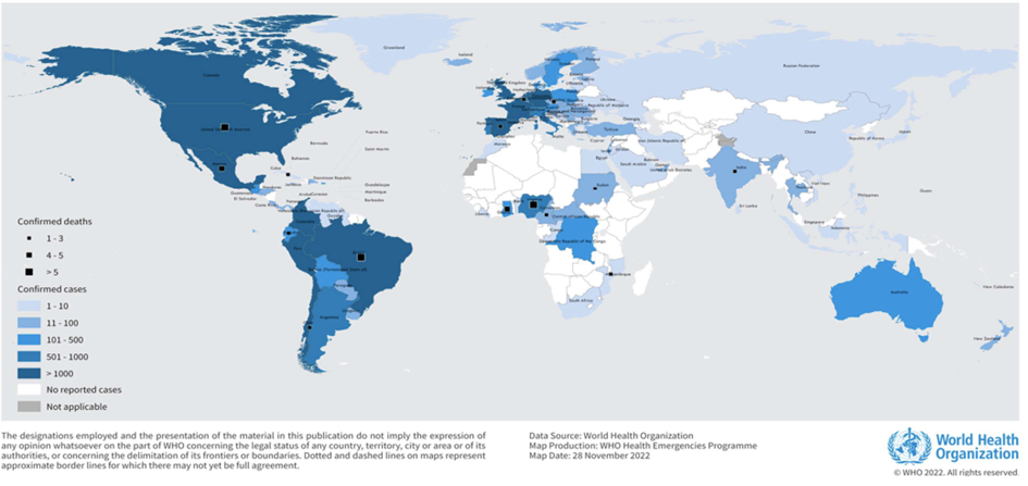 Şekil 2. 1 Ocak – 27 Kasım 2022 tarihleri arasında ve saat 17:00 (CEST) itibariyle resmi kamu kaynaklarından DSÖ'ye bildirilen veya DSÖ tarafından tanımlanan doğrulanmış mpox vakalarının coğrafi dağılımı