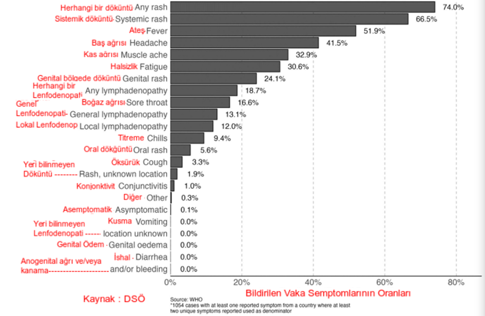 Bildirilen en az bir semptomu olan 1054 vakanın %74'ü herhangi bir döküntü, %66,5'i sistemik döküntü, %24,1'i genital döküntü ve %2'si bilinmeyen bir yerde döküntü ile başvurmuştur. Döküntülerden sonra en sık görülen semptom ateş (%52), bunu baş ağrısı (%41,5) ve kas ağrısı (%32,9) izlemiştir (Şekil 6).