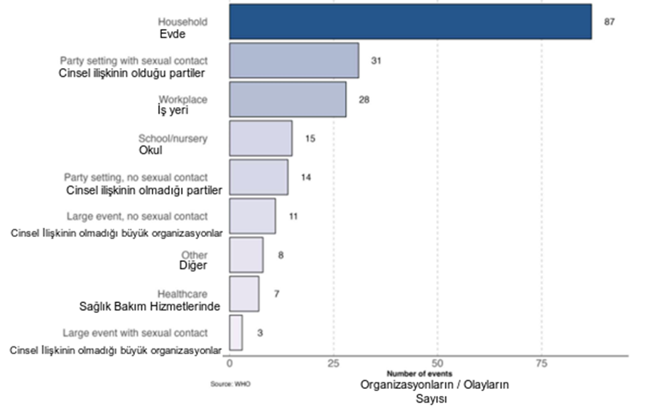 Cinsel yönelimin bildirildiği vakalardan kadınların çoğunluğu heteroseksüeldi (648/747; %87); en çok rapor edilen maruz kalma ortamı bir ev olup (87/204; %43) en yaygın bulaşma şekli cinsel ilişki (198/474; %42) olmuştur (Şekil 4 ve 5) .