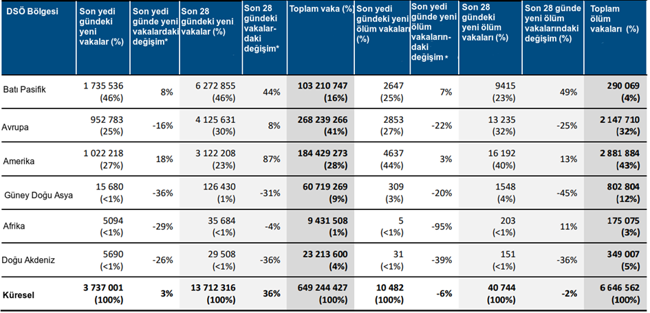 Küresel olarak, 12-18 Aralık 2022 tarihleri rasında bildirilen haftalık yeni vaka sayısı, bildirilen 3,7 milyondan fazla yeni vakayla bir önceki haftaya benzer bir tablo çizmiştir (+%3) (Şekil 1, Tablo 1). Haftalık yeni ölüm vakalarının sayısı, bildirilen 10.400'den fazla yeni ölümle bir önceki haftaya göre %6 daha düşük olduğu görülmüştür. Son 28 günde, dünya çapında 13,7 milyondan fazla vaka ve 40.000'den fazla yeni ölüm vakası rapor edilmiştir - önceki 28 güne kıyasla sırasıyla %36 artış ve %2 düşüş gerçekleşmiştir. 18 Aralık 2022 itibariyle, dünya çapında 649 milyondan fazla doğrulanmış vaka ve 6,6 milyondan fazla ölüm bildirilmiştir.