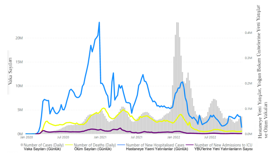 Şekil 6. 11 Aralık 2022 itibarıyla DSÖ'ye haftalık olarak bildirilen COVID-19 vakaları, ölüm vakaları, hastane ve yoğun bakım ünitesine yatışlar