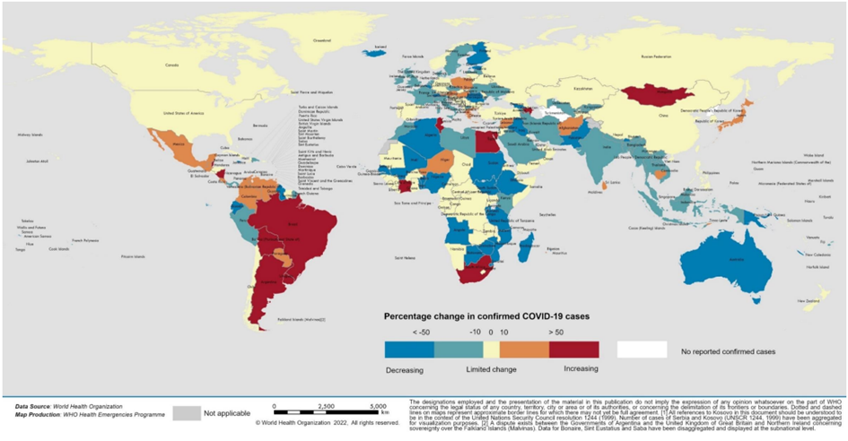 Ülke düzeyinde, en yüksek haftalık yeni vaka sayıları Japonya (1.046.650 yeni vaka; +%23), Güney Kore (459.811 yeni vaka; +%9), Amerika Birleşik Devletleri (445. 424 yeni vaka; -%3), Fransa (341 136 yeni vaka; -%20) ve Brezilya’dan (337 810 yeni vaka; +%74) bildirilmiştir. En yüksek yeni haftalık ölüm vakası sayıları ise Amerika Birleşik Devletleri (2658 yeni ölüm; -%13), Japonya (1617 yeni ölüm; +%19), Brezilya (1133 yeni ölüm; +%88), Fransa (686 yeni ölümler; +%27) ve İtalya’dan (519 yeni ölüm; -%23) rapor edilmiştir.