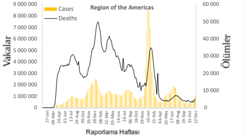 Amerika Bölgesi, bir önceki haftaya göre %18 artışla bir milyondan fazla yeni vaka bildirmiştir. Verilerin mevcut olduğu 56 ülkenin on ikisi (%21) yeni vakalarda %20 veya daha fazla artış bildirmiş olup en yüksek oransal artışlar Belize (259'a karşı 69 yeni vaka; +%275), Nikaragua (45'e karşı 13 yeni vakalar; +%246) ve Saint Vincent ve Grenadinler’de (sekiz yeni vakaya karşı 18; +%125) gözlenmiştir. En yüksek yeni vaka sayıları Amerika Birleşik Devletleri (445.424 yeni vaka; 100.000'de 134.6 yeni vaka; -%3), Brezilya (337.810 yeni vaka; 100.000'de 158.9 yeni vaka; +%74) ve Arjantin’den (62.261 yeni vaka; 100.000'de 137.8 yeni vaka; +%130) rapor edilmiştir.