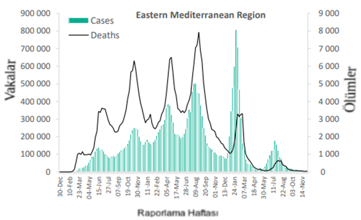 Bölgede haftalık yeni ölüm sayısı bir önceki haftaya göre %39 azalmış ve 31 yeni ölüm bildirilmiştir. En yüksek yeni ölüm sayıları Suudi Arabistan (12 yeni ölüm; 100.000'de <1 yeni ölüm; +%9), Fas (altı yeni ölüm; 100.000'de <1 yeni ölüm; +%100) ve Afganistan’tan (beş yeni ölüm; <100 000'de 1 yeni ölüm; önceki haftaya benzer) rapor edilmiştir.