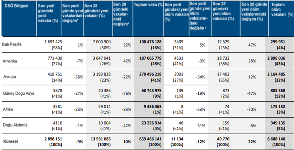 Bölgesel düzeyde, yeni bildirilen haftalık vaka sayısı tüm DSÖ bölgelerinde azalmış veya sabit kalmıştır: Avrupa Bölgesi (%-36), Güneydoğu Asya Bölgesi (%-27), Afrika Bölgesi (%-23), Amerika Bölgesi (%-7), Doğu Akdeniz Bölgesi (%-1) ve Batı Pasifik Bölgesi (%+1). Yeni bildirilen haftalık ölüm vakalarının sayısı dört bölgede azalmış veya sabit kalmıştır: Doğu Akdeniz Bölgesi'nde (+%31) ve Batı Pasifik Bölgesi'nde (+%5) ölüm sayıları artarken Afrika Bölgesi (%-53), Avrupa Bölgesi (%-34), Güneydoğu Asya Bölgesi (%-19) ve Amerika Bölgesi’nde (%-3) azalmıştır.