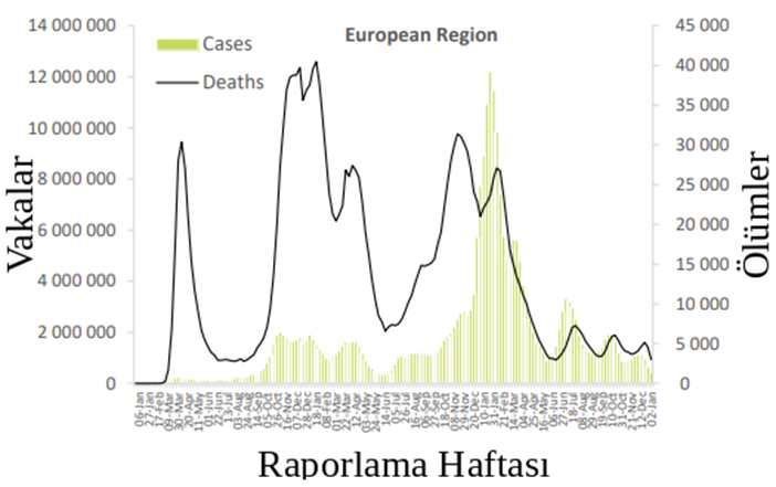 Avrupa Bölgesi, bir önceki haftaya göre %36 düşüşle 418.000'den fazla yeni vaka bildirmiştir. Verilerin mevcut olduğu 61 ülkenin yedisi (%11) yeni vakalarda %20 veya daha fazla artış bildirmiş olup en yüksek oransal artış Kosova [1] (52'ye karşı 35 yeni vaka; +%49), Malta ( 241'e karşı 167 yeni vaka; +%44) ve Kıbrıs Adası’nda (KKTC ve GKRY) (3598'e karşı 2602 yeni vaka; +%38) gözlemlenmiştir. En yüksek yeni vaka sayıları Almanya (121.007 yeni vaka; 100.000'de 145.5 yeni vaka; -%21), İtalya (86.851 yeni vaka; 100.000'de 145.6 yeni vaka; -%34) ve Fransa'dan ( 73 186 yeni vaka; 100.000'de 112.5 yeni vaka; -%52) rapor edilmiştir.