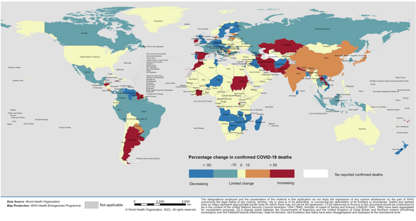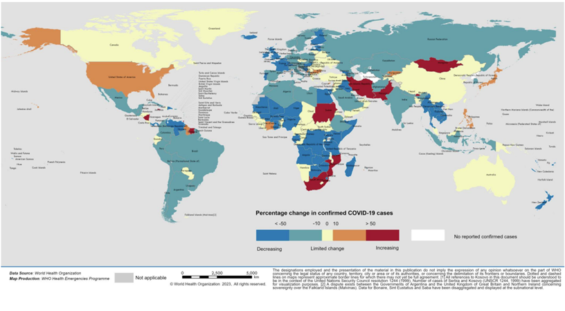 2-8 Ocak 2023 haftasında küresel olarak yaklaşık 2,9 milyon yeni vaka ve 11.000'den fazla ölüm bildirilmiştir. Bu, haftalık vakalarda ve ölümlerde sırasıyla %9 ve %12'lik bir azalmayı temsil etmektedir. Ancak bu eğilimlerin, yıl sonu tatil sezonunda birçok ülkede test sayısındaki azalma ve raporlamadaki gecikmeler dikkate alınarak yorumlanması gerekiyor.