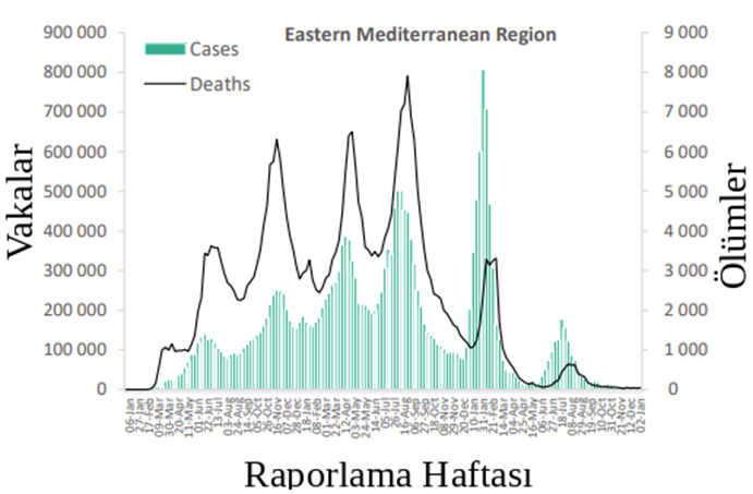 Bölgede haftalık yeni ölüm sayısı bir önceki haftaya göre %31 artmış ve 46 yeni ölüm bildirilmiştir. En yüksek yeni ölüm vakası sayıları İran (21 yeni ölüm; 100.000'de <1 yeni ölüm; +%75), Suudi Arabistan (11 yeni ölüm; 100.000'de <1 yeni ölüm; +%10) ) ve Lübnan’dan (altı yeni ölüm; 100.000'de <1 yeni ölüm; +%100) rapor edilmiştir.