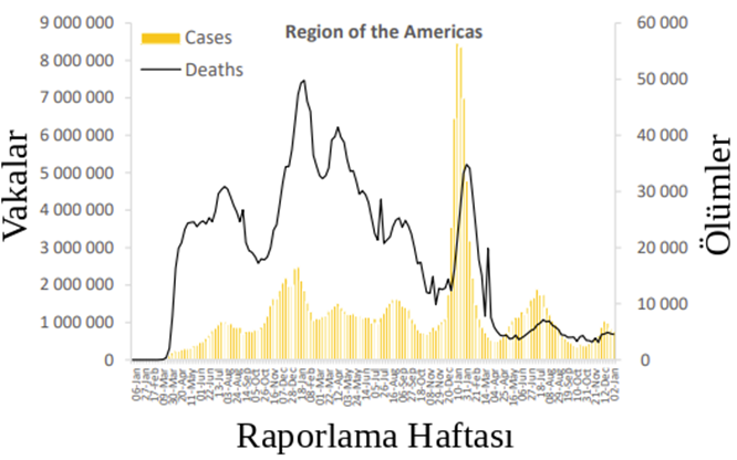 Amerika Bölgesi, bir önceki haftaya göre %7 düşüşle 771.000'den fazla yeni vaka bildirmiştir. Verilerin mevcut olduğu 56 ülkenin üçü (%5) yeni vakalarda %20 veya daha fazla artış bildirmiştir; orantılı olarak en yüksek artışlar Saint Barthelemy (10'a karşı altı yeni vaka; +%67), Trinidad ve Tobago ( 246'ya karşı 151 yeni vaka; +%63) ve Guyana’da (234'e karşı 159 yeni vaka; +%47) gözlemlenmiştir. En yüksek yeni vaka sayıları Amerika Birleşik Devletleri (462.944 yeni vaka; 100.000'de 139.9 yeni vaka; +%17), Brezilya (145.933 yeni vaka; 100.000'de 68.7 yeni vaka; -%29) ve Arjantin’den (40.982 yeni vaka; 100.000'de 90.7 yeni vaka; -%44) rapor edilmiştir.