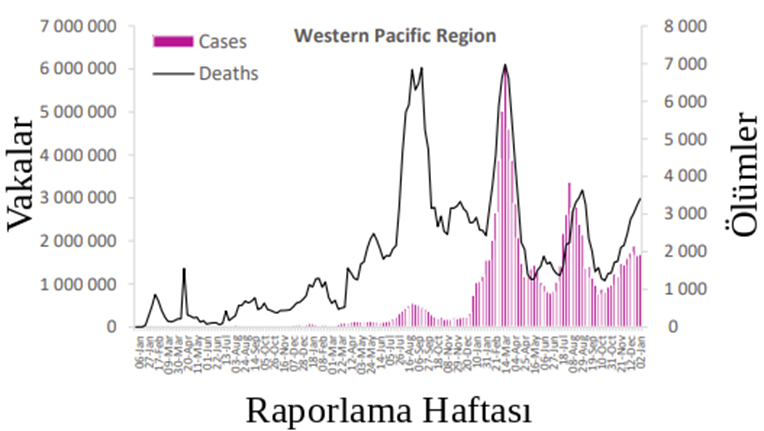 Bölgede haftalık yeni ölüm sayısı bir önceki haftaya göre %5 artarak 3409 yeni ölüm bildirilmiştir. En yüksek yeni ölüm sayıları Japonya (2149 yeni ölüm; 100.000'de 1,7 yeni ölüm; +%11), Çin (722 yeni ölüm; 100.000'de <1 yeni ölüm; +%11) ve Güney Kore’den (371 yeni ölüm; her 100 000'de <1 yeni ölüm; -%14) rapor edilmiştir.