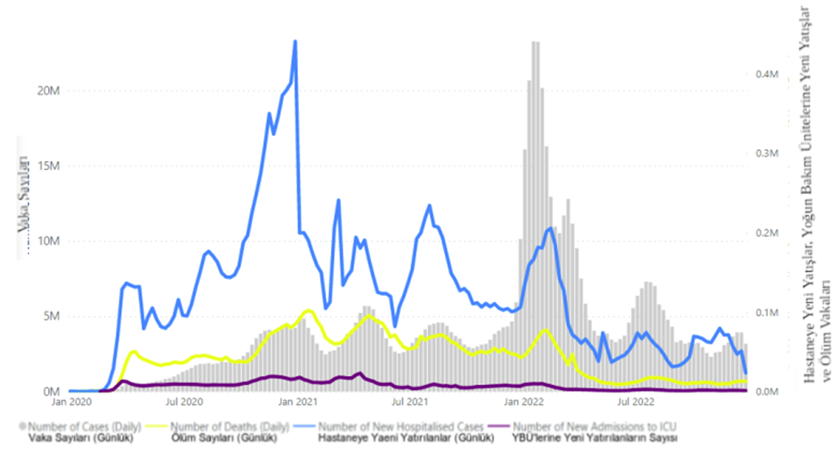 Şekil 6. 1 Ocak 2023 itibarıyla DSÖ'ye haftalık olarak bildirilen COVID-19 vakaları, ölüm vakaları, hastane ve yoğun bakım ünitesine yatışlar