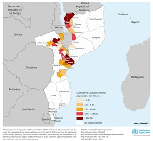 19 Şubat 2023 itibariyle, ülkedeki 11 yönetim bölgesinin 6’sındaki 29 ilçede toplam 5237 şüpheli vaka ve 37 ölüm (CFR %0,7) bildirilmiştir. Test edilen en az 182 vakanın 99'u (%54) kültür yoluyla Vibrio cholerae Ogawa'nın tanımlanması sayesinde kolera için laboratuvar tarafından doğrulandı. 19 Şubat itibariyle, Niassa yönetim bölgesinin (ülkenin kuzeyindeki) sekiz ilçesi (Chimbonila, Lago, Lichinga, Mandimba, Mecanhelas, Muembe, Ngauma ve Sanga) 2525 vaka ve 16 ölüm (CFR %0,6) bildirdi. Ülkenin orta bölgesinde, Sofala ilinin dokuz ilçesi (Beira, Buzi, Caia, Cheringoma, Chibabava, Gorongoza, Maringue, Marromeu, Muanza) 1354 vaka ve üç ölüm (CFR %0,2) bildirdi. Tete eyaletinden dokuz ilçe (Angonia, Cahora Bassa, Chiuta, Doa, Marara, Moatize, Mutarara, Tete, Tsangano), Aralık 2022'den bu yana 12 ölümle (CFR %0,9) 1271 vaka bildirdi. Malavi sınırındaki Zambezia eyaletinde (Milange bölgesi) 14 vaka bildirildi. Ülkenin güney bölgesinde, Gazze vilayetindeki bir ilçe (Xai-Xai) 42 vaka ve 4 ölüm bildirdi (CFR %9,5). Ayrıca Manica ilindeki bir ilçe (Tambara) 34 vaka ve 2 ölüm bildirdi (CFR %5,9).