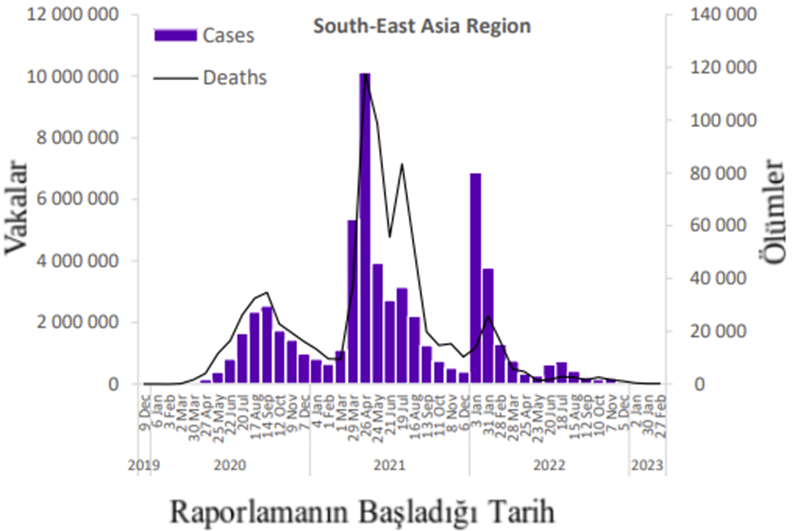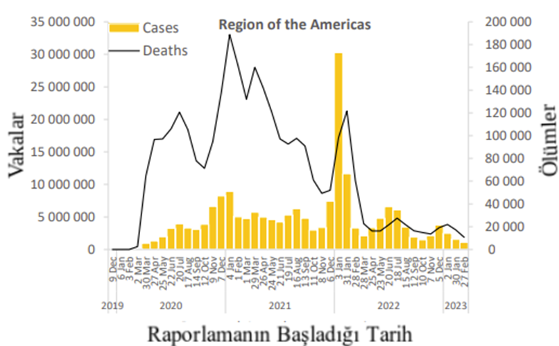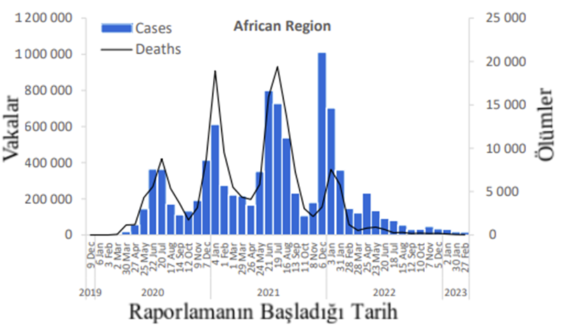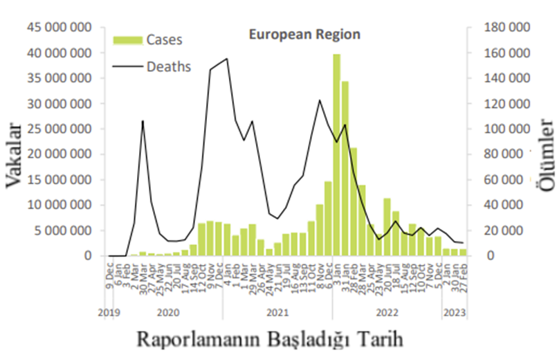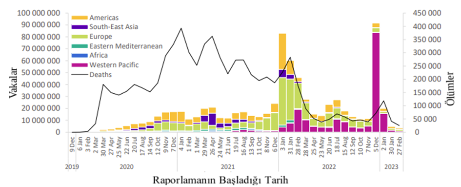 Şekil 1. 26 Mart 2023 itibarıyla 28 günlük aralıklarla WHO Bölgesi tarafından bildirilen COVID-19 vakaları ve küresel ölümler***