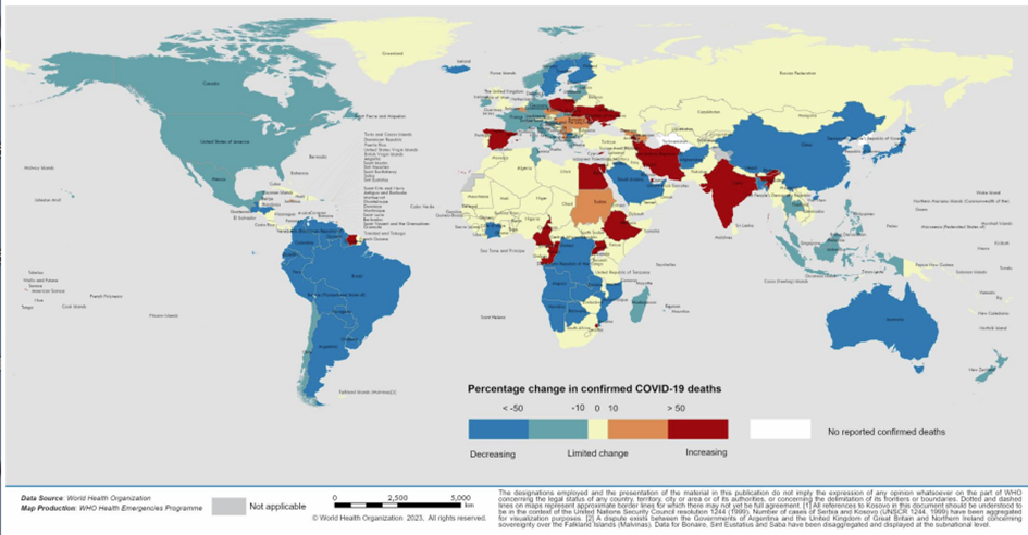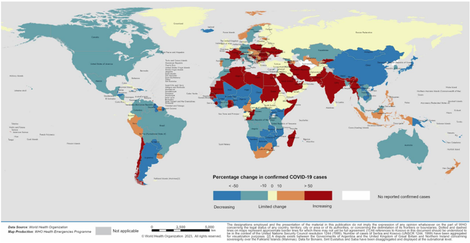 Küresel olarak, son 28 günde (27 Şubat - 26 Mart 2023) yaklaşık 3,6 milyon yeni vaka ve 25.000'den fazla ölüm rapor edilmiş olup önceki 28 güne kıyasla sırasıyla %27 ve %39 düşüş yaşanmıştır.