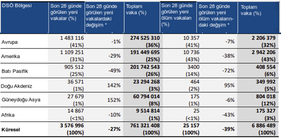 Küresel olarak, son 28 günde (27 Şubat - 26 Mart 2023) yaklaşık 3,6 milyon yeni vaka ve 25.000'den fazla ölüm rapor edilmiş olup önceki 28 güne kıyasla sırasıyla %27 ve %39 düşüş yaşanmıştır (Şekil 1, Tablo 1).