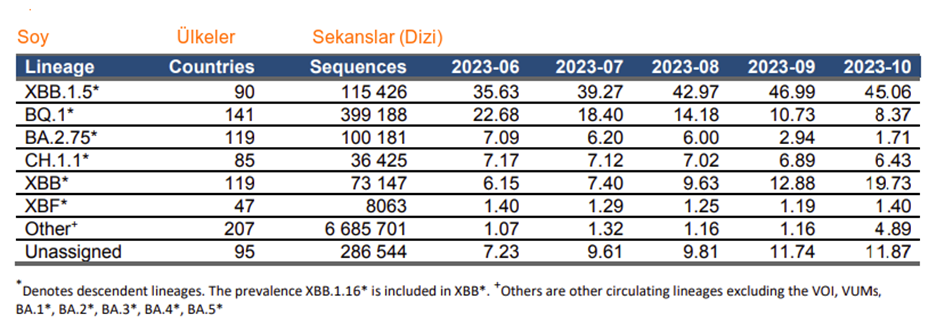 Küresel olarak XBB.1.5, epidemiyolojik 10. haftada (6 - 12 Mart 2023) vakaların %45,1'ini oluştururken, 6. haftada (6 - 12 Şubat 2023) %35,6'dır. Bugüne kadar, XBB.1.5 90 ülkede tespit edilmiştir. 6. haftadan 10. haftaya kadar GISAID'e gönderilen dizilerin karşılaştırılması, %6,2'den %19,7'ye yükselen XBB hariç tüm VUM'lar için azalan veya sabit eğilimler göstermektedir. Diğer değişkenlerin gözlenen eğilimleri şu aşağıdaki gibi olmuştur: BQ.1 %22,7'den %8,4'e, BA.2.75 %7,1'den %1,7'ye düşmüş ve CH.1.1 ve XBF sabit kalmıştır (%7,2'den %6,4'e ve %1,4) sırasıyla %1,4'e). Tablo 2, VOI ve VUM'ları bildiren ülkelerin sayısını ve bunların 6. haftadan 10. haftaya kadar yaygınlığını göstermektedir.