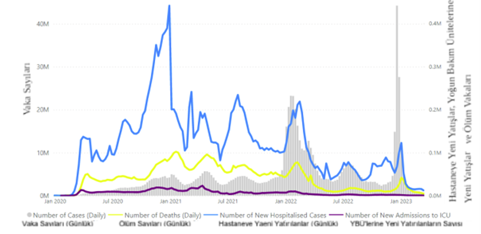 Şekil 4. 19 Mart 2023 itibarıyla DSÖ'ye haftalık olarak bildirilen COVID-19 vakaları, ölüm vakaları, hastane ve yoğun bakım ünitesine yatışlar