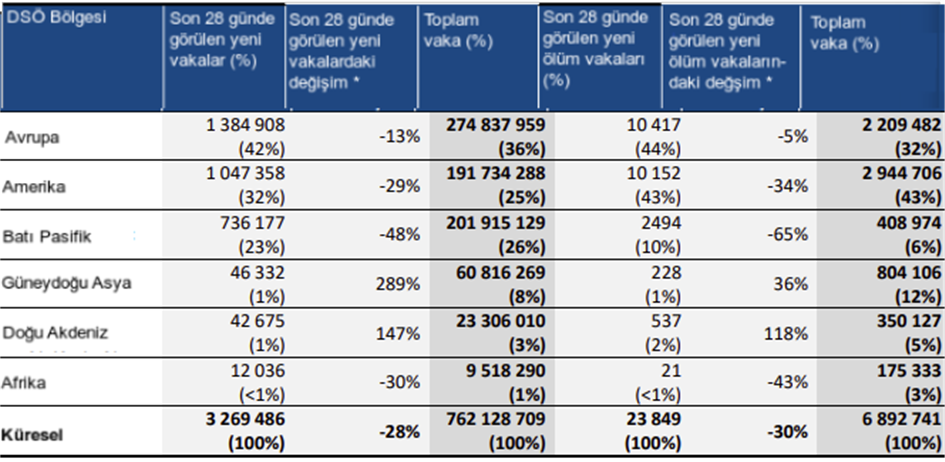 Bölgesel düzeyde, yeni bildirilen 28 günlük vaka sayısı altı DSÖ bölgesinin dördünde azalmıştır: Vakalar iki DSÖ bölgesinde Doğu Akdeniz Bölgesi (+%147) ve Güneydoğu Asya Bölgesinde (+%289) artarken Batı Pasifik Bölgesi (%-48), Afrika Bölgesi (%-30), Amerika Bölgesi (-29) %) ve Avrupa Bölgesinde (%-13) azalmıştır. Yeni bildirilen 28 günlük ölümlerin sayısı dört bölgede azalmıştır: Ölümler iki DSÖ bölgesinde Doğu Akdeniz Bölgesi (+%118) ve Güneydoğu Asya Bölgesinde (+%36) artarken Batı Pasifik Bölgesi (%-65), Afrika Bölgesi (%-43), Amerika Bölgesi (%-34) ve Avrupa Bölgesinde (- %5) azalmıştır.
