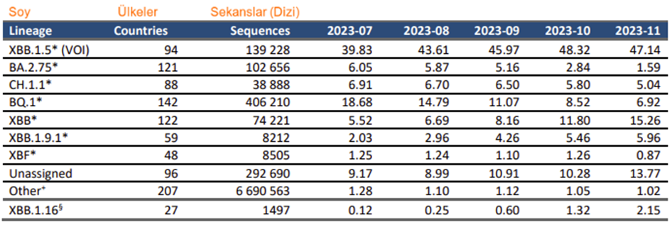 + Diğerleri, VOI, VUM'lar, BA.1*, BA.2*, BA.3*, BA.4*, BA.5* hariç diğer dolaşımdaki soylardır.
