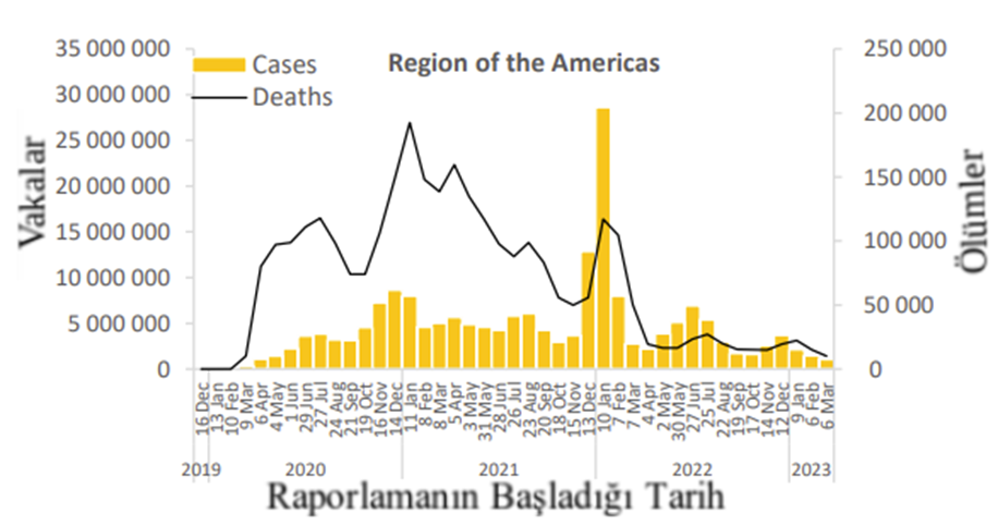 Şekil 1. 2 Nisan 2023 itibarıyla DSÖ Bölgesi tarafından bildirilen COVID-19 vakaları ve 28 günlük aralıklarla küresel ölümler**